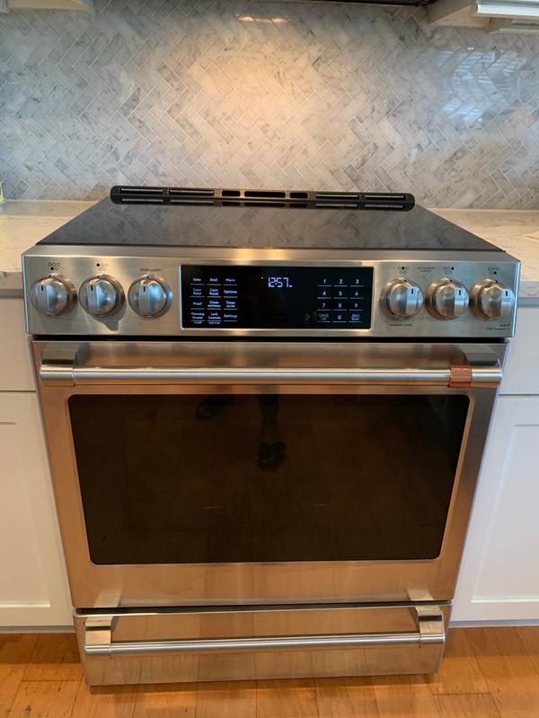 Slide in electric range with true convection.