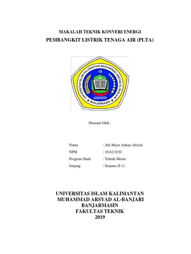 Makalah konversi energi pembangkit listrik tenaga air plta disusun sebagai salah satu tugas mata kuliah energi dan konversi.